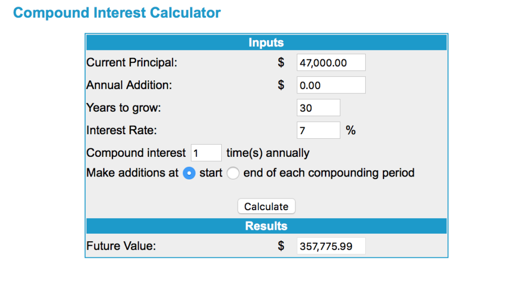 Maximize your defined contribution limit as soon as your can. It will turbo-boost your retirement savings and save you a lot of money that you can invest. In our example, we saved $47,000. Using the compound interest calculator from moneychimp.com, you can see how much $47,000 will grow over the course for 30 years with an interest rate of 7%. Making this change now can potentially increase your future retirement savings by over $350,000.