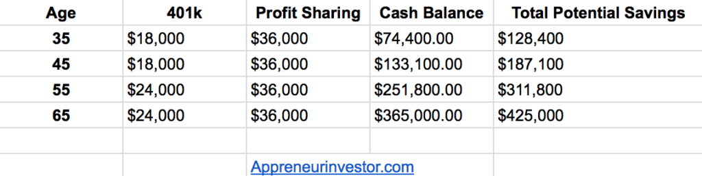 Cash balance plan contribution plan limits are based on age. The close you are to retirement, the more you can save. This has always been the biggest disadvantage for young entrepreneurs and young investors. Performing well early on and having unpredictable income later in age is something we have to work around by taking advantages of the perks. Time is the biggest perk for starting younger. Combine time with saving as much as you can early on and you are well on your way to hit your retirement goals.