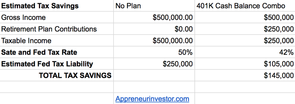 Total tax savings are huge. Having a wildly successful year can leave you worried when tax season comes. Let’s look at an example of earning $500,000 in a year with no plan vs having a 401k and cash balance plan. Contributing $250,000 lowers your taxable income by half and saves you even more tax dollars by putting you at a lower state and fed tax rate of roughly 42%. That’s a total tax savings of $145,000. An extra $145,000 you can invest in a taxable account to reach early retirement faster.